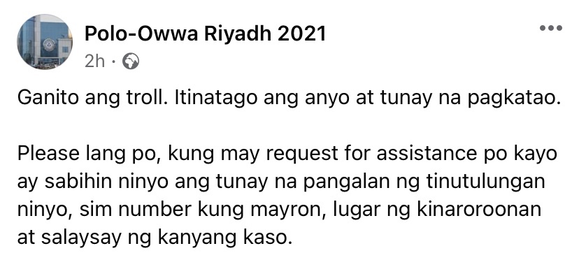 Please lang po, kung may request for assistance po kayo ay sabihin ninyo ang tunay na pangalan ng tinutulungan ninyo, sim number kung mayron, lugar ng kinaroroonan at salaysay ng kanyang kaso.